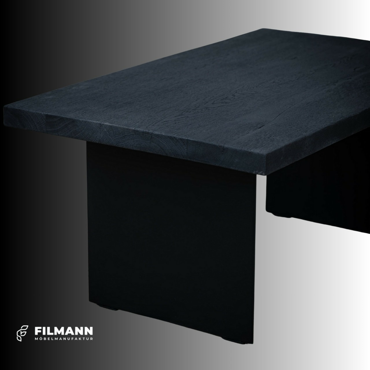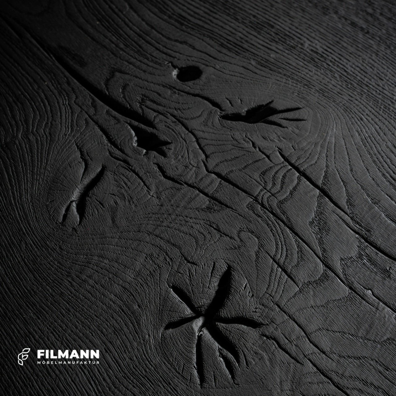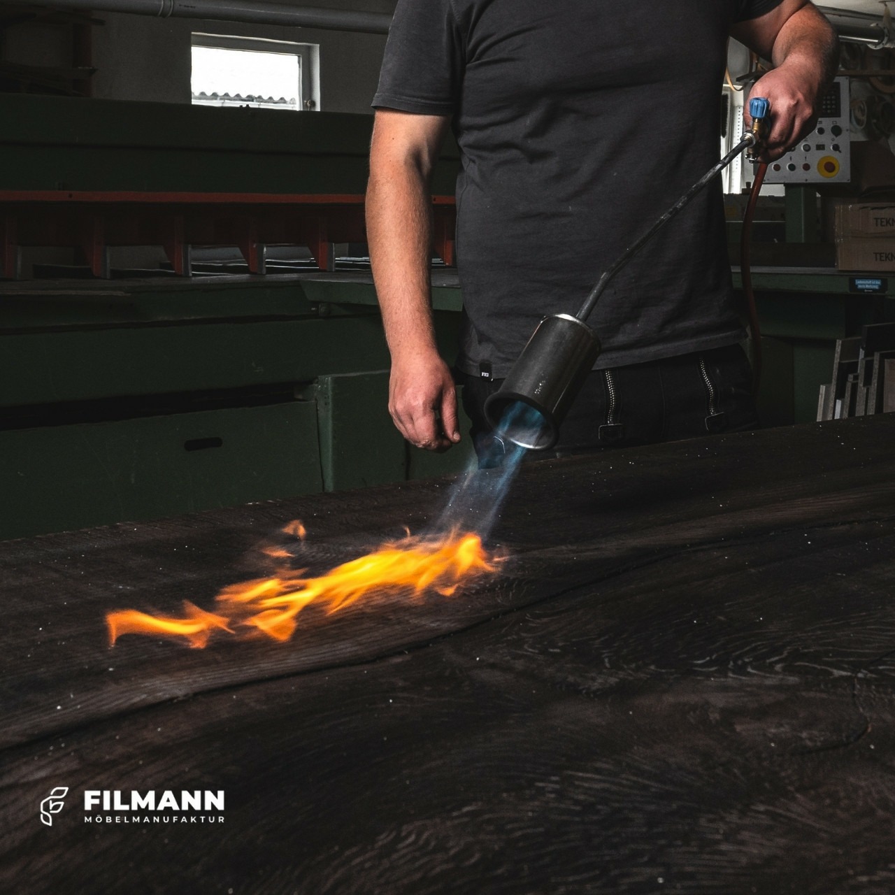 Bei der traditionellen Köhlung wird die Oberfläche des Holzes mit kontrolliertem Feuer bearbeitet. Dabei entsteht ein tiefes, samtiges Schwarz, das die Maserung lebendig hervorhebt und dem Tisch seine besondere Tiefe verleiht. Jede Platte erhält so ein einzigartiges Finish, das sich angenehm weich anfühlt und optisch beeindruckt.